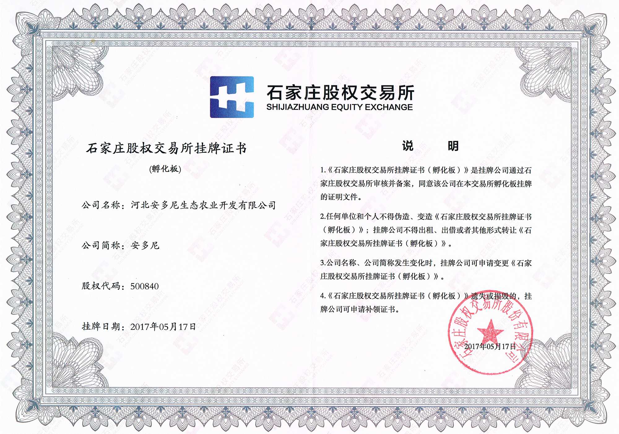 安多尼生態(tài)農(nóng)業(yè)開發(fā)有限公司專業(yè)從事生態(tài)農(nóng)業(yè)和微生物肥料研發(fā)、生產(chǎn)和銷售,并于2017年在河北石家莊股權(quán)交易所掛牌,股權(quán)代碼:500840。